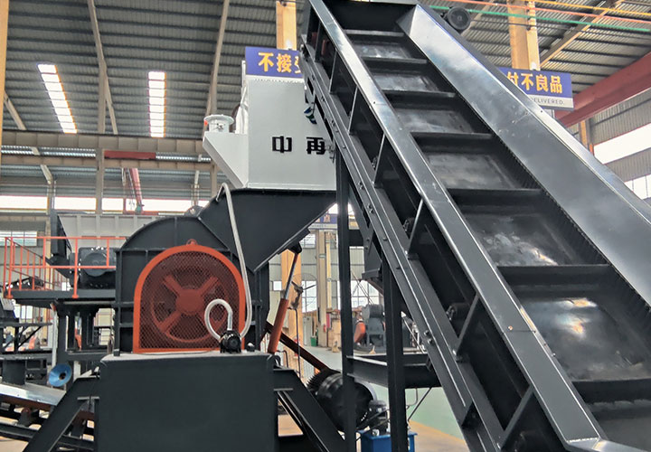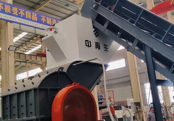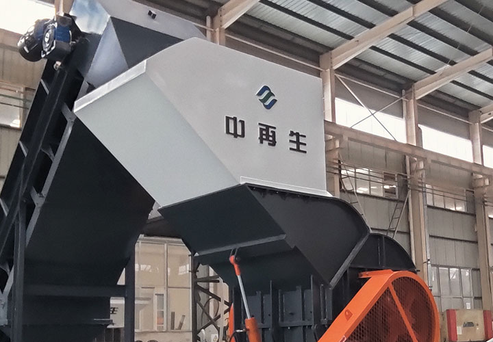 破碎線主機殼體采用特厚鋼板制造,內襯為高錳鑄鋼件,可更換;主機轉子盤安裝于水平軸上,轉子盤圓周分布有銷軸,軸向懸有錘頭;主軸用滾珠軸承支撐,循環(huán)油強制潤滑冷卻,并裝有溫度傳感器;進料口裝有液壓輥筒喂料裝置,位置一高一低,同向旋轉,能將大件松散物料壓扁,送入破碎腔內。