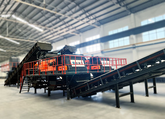 破碎線主機殼體采用特厚鋼板制造,內(nèi)襯為高錳鑄鋼件,可更換;主機轉(zhuǎn)子盤安裝于水平軸上,轉(zhuǎn)子盤圓周分布有銷軸,軸向懸有錘頭;主軸用滾珠軸承支撐,循環(huán)油強制潤滑冷卻,并裝有溫度傳感器;進料口裝有液壓輥筒喂料裝置,位置一高一低,同向旋轉(zhuǎn),能將大件松散物料壓扁,送入破碎腔內(nèi)。