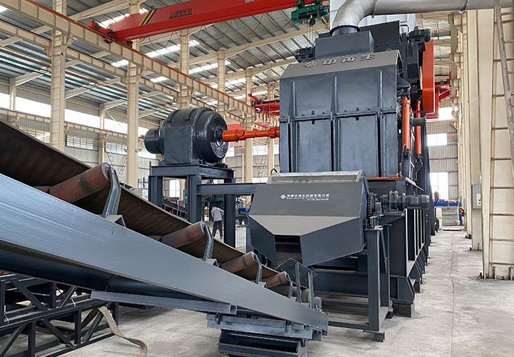 破碎線主機(jī)殼體采用特厚鋼板制造,內(nèi)襯為高錳鑄鋼件,可更換;主機(jī)轉(zhuǎn)子盤安裝于水平軸上,轉(zhuǎn)子盤圓周分布有銷軸,軸向懸有錘頭;主軸用滾珠軸承支撐,循環(huán)油強(qiáng)制潤滑冷卻,并裝有溫度傳感器;進(jìn)料口裝有液壓輥筒喂料裝置,位置一高一低,同向旋轉(zhuǎn),能將大件松散物料壓扁,送入破碎腔內(nèi)。